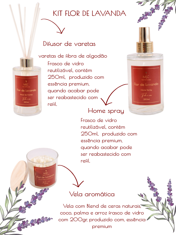 KIT FLOR DE LAVANDA: É composto por três produtos, difusor de varetas home spray e vela aromática do aroma FLOR DE LAVANDA, é profundamente relaxante e calmante , trazendo um sensação de paz e tranquilidade e criando um atmosfera de comforto é ideal para quem busca um refúrio do estresse diário.