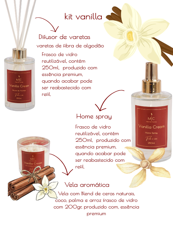 KIT VANILLA CREAM: composto por três produtos, difusor de varetas, home spray e vela aromática do aroma VANILLA CREAM é conhecida como uma fragrância adocicada, frequentemente descrita como um abraço olfativo que transforma ambiente tornando-os mais quentes e convitativo. nosso kit é composto por trés deprodutos, este kit é perfeito para completar seu espaço e trazer tranquilidade, paz e uma sensação de equilibrio.